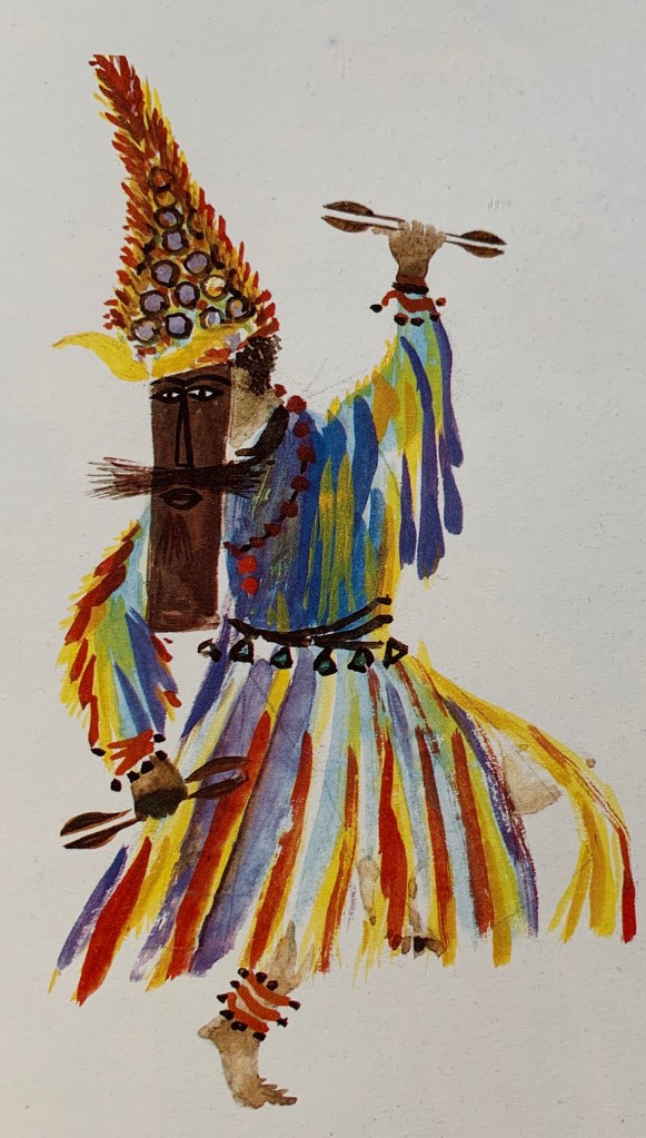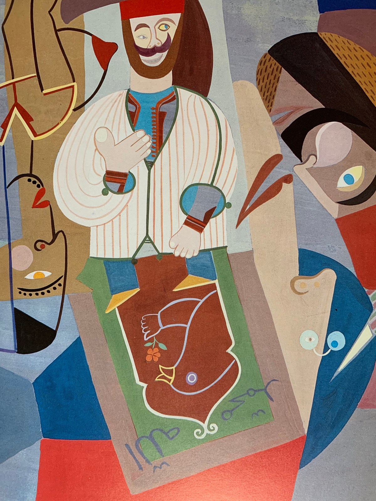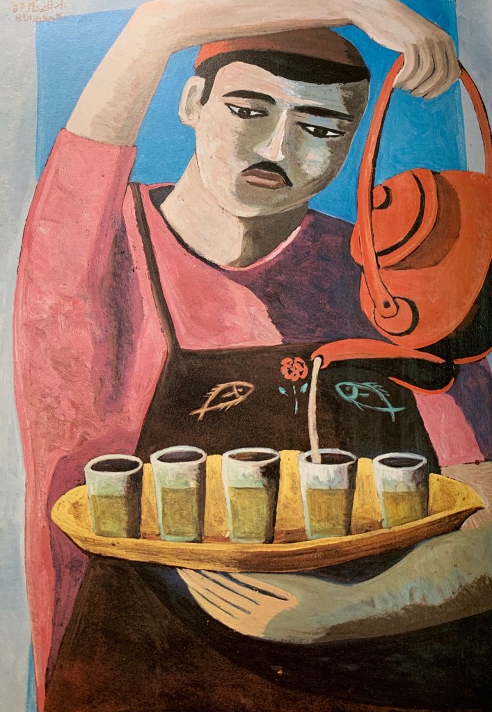 L’œuvre suivante représente « boussadia », un danseur ambulant couverts d’accessoires sonores : c’est un spectacle burlesque et polyphonique qui nous attend au coin d’un souk ou d’un café, la musique endiablée du tambourin se mélange aux applaudissements, aux rires des enfants et aux chansons improvisées des passants.