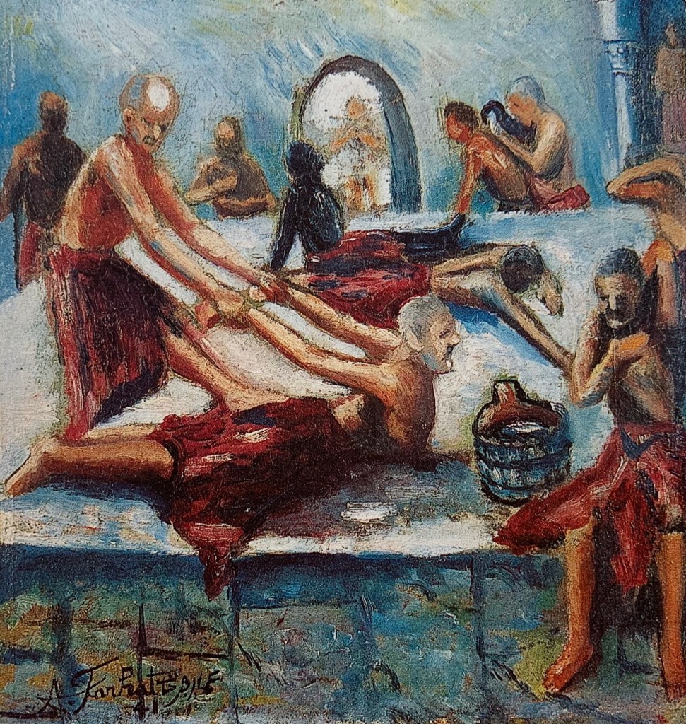 Nous sommes dans la salle tiède d’un bain maure pour homme sur une table de massage en marbre. Le masseur « taïab » est habile et discret. Qu’entendons-nous? Le craquement des os et les gémissements de soulagement, l’écoulement de l’eau dans la salle chaude par laquelle s’échappe la vapeur qui floute la peinture, ou encore les réclamations courtes et chuchotées des baigneurs.