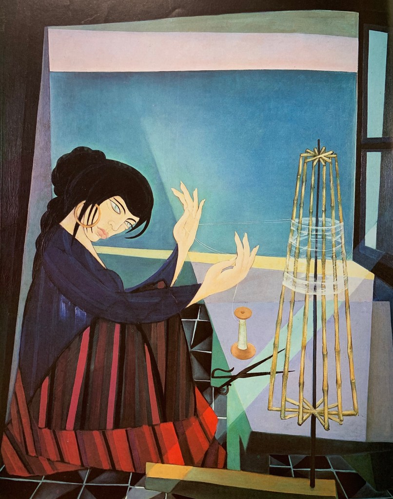 Dans la solitude de la maisonnée, le silence est ponctué par le grincement de la fileuse et les coups secs des ciseaux.