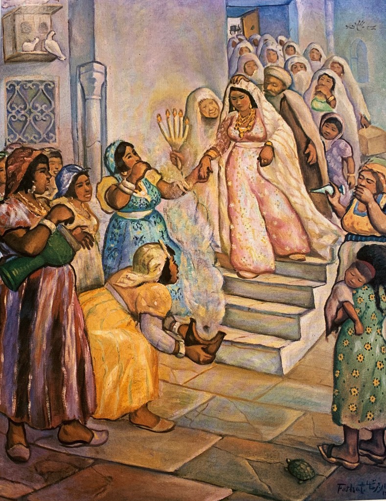 Les derniers moment de la cérémonie du mariage. Se mêlent aux youyous résonnants, les louanges au dieu et à son prophète Mohamed et les souhaits chantés avec ardeurs pour accompagner la mariée sortant de la maison de ses parents pour aller à sa nouvelle demeure conjugale.