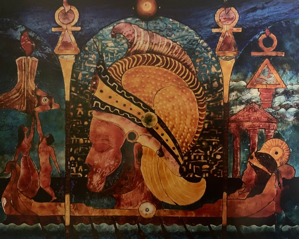 Si l’artiste avait l’intension de constituer un alphabet, lui permettant de confiner des messages, son dernier tableau, intitulé « Lettre à mon pays », semble exprimer sa fierté d’appartenir à une terre millénaire. Il s’agit d’une fresque composée comme un triptyque dont chaque partie raconte un épisode de l’histoire du pays avec la répétition du signe du Tanit, la déesse punique de la fertilité.